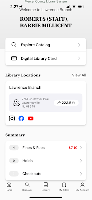 Upon logging in, you’ll land on the Home screen. At the top, you’ll see a friendly welcome message. In the middle, you’ll also see “Library Locations” with relevant branch addresses, social media links, and approximate distance from your location—useful if you’re deciding which branch to visit. At the bottom is your current account summary—fines and fees, the number of holds, and any current checkouts. This is a good at-a-glance summary if you just want to know if you have items due soon or if you need to pay an overdue balance.
